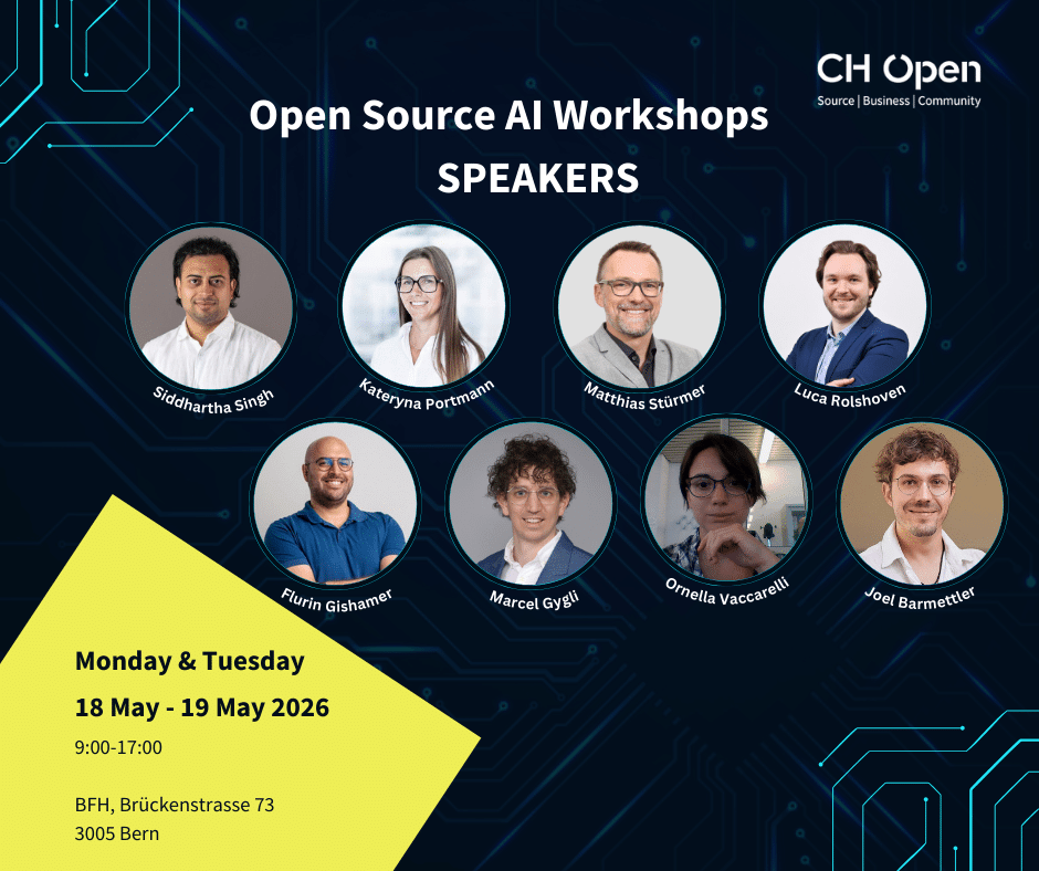 Discover the future of Open Source AI! Join us on May 18 and May 19, 2026 for the second Open Source AI Workshops in Bern. You can check out the programme right here and regsiter now!